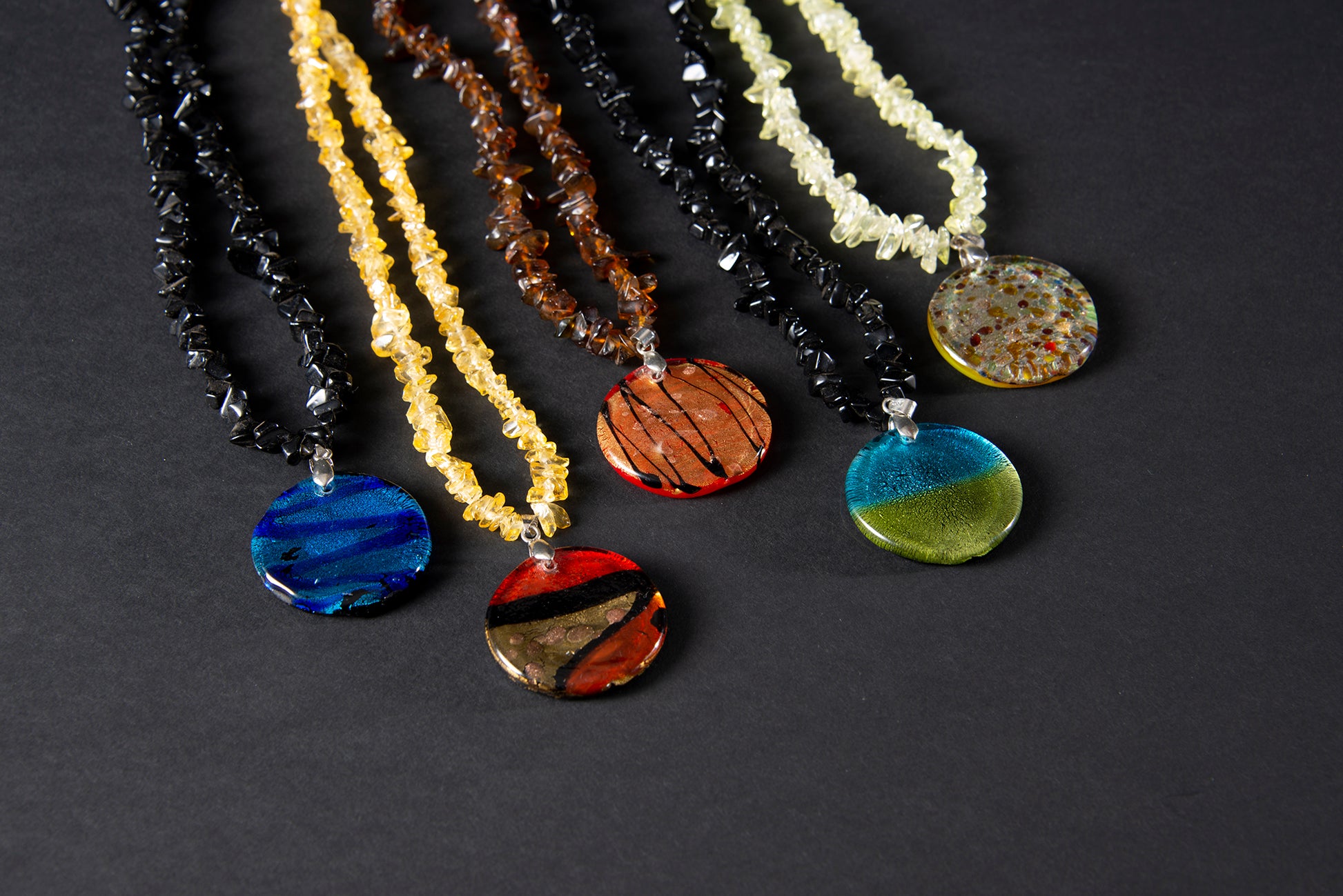 "Chip String" Necklaces use small glass beads wired together to form the neck band, with a hand blown medallion. Due to the handcrafted nature of this piece, color and style may differ slightly from imagery below.