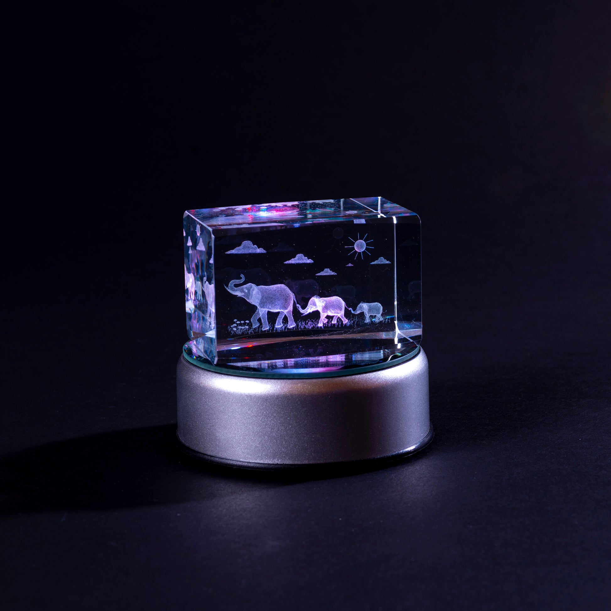 This 3D laser etched crystal block features a detailed etching of a train of elephants. The Laser Cube stands 3 inches tall, and is 1 3/4 inches wide. Add a light box base with this great laser engraved glass cube to illuminate the intricate details of this amazing design.