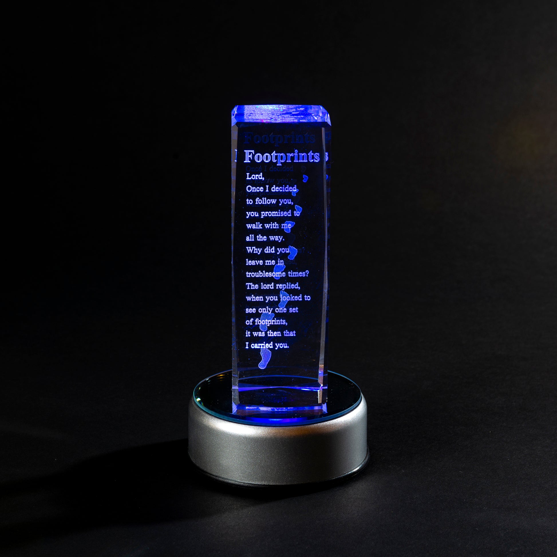 This 3D laser etched crystal block features a detailed etching of the poem "Footprints". The Laser Cube stands 6 inches tall, and is 1 3/4 inches wide. Add a light box base with this great laser engraved glass cube to illuminate the intricate details of this amazing design.
