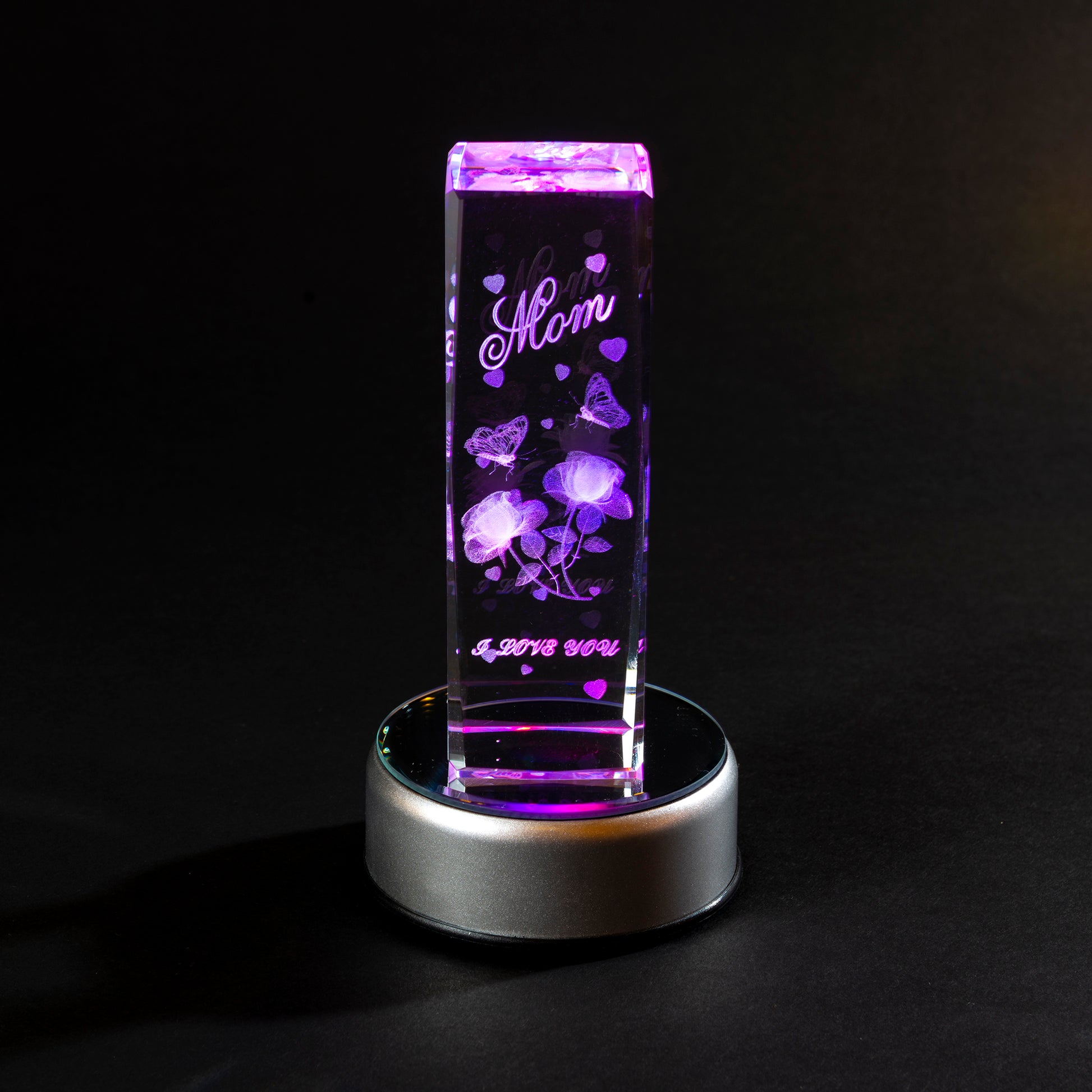 This 3D laser etched crystal block features a detailed etching of the phrase "I Love You Mom". The Laser Cube stands 6 inches tall, and is 1 3/4 inches wide. Add a light box base with this great laser engraved glass cube to illuminate the intricate details of this amazing design.