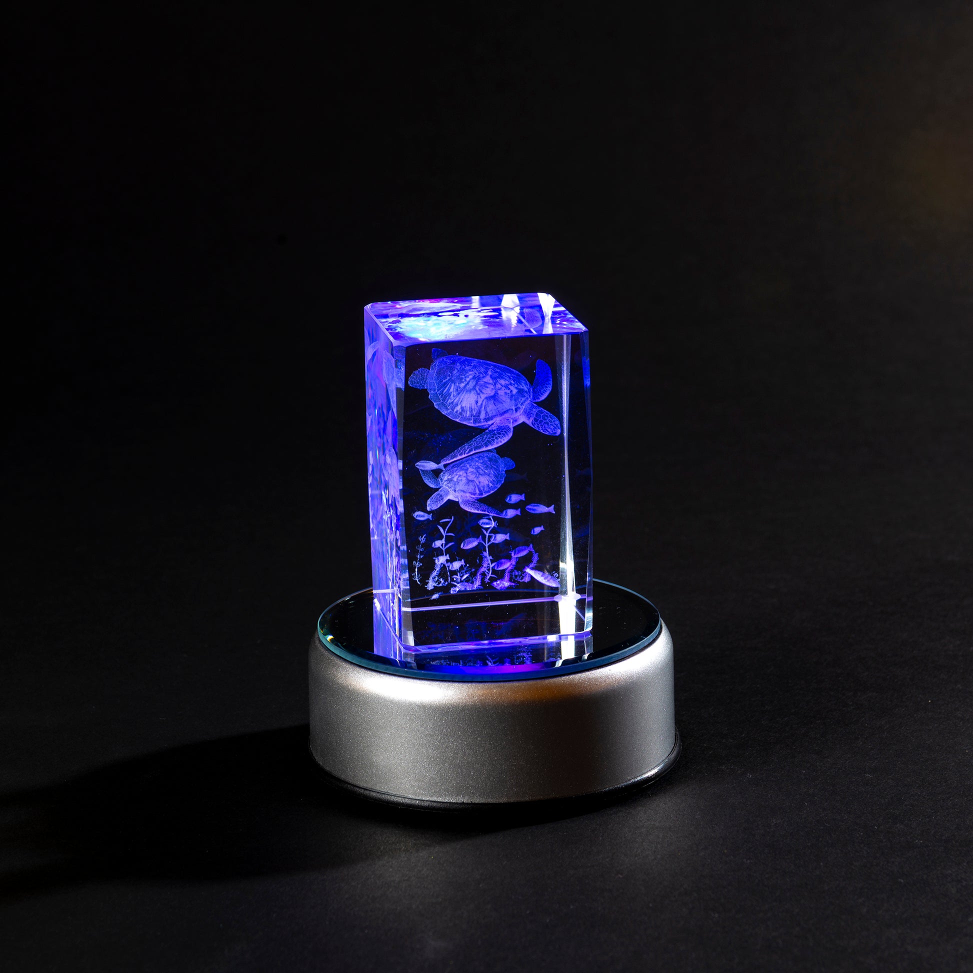 This 3D laser etched crystal block features a detailed etching of two sea turtles. The Laser Cube stands 3 inches tall, and is 1 3/4 inches wide. Add a light box base with this great laser engraved glass cube to illuminate the intricate details of this amazing design.