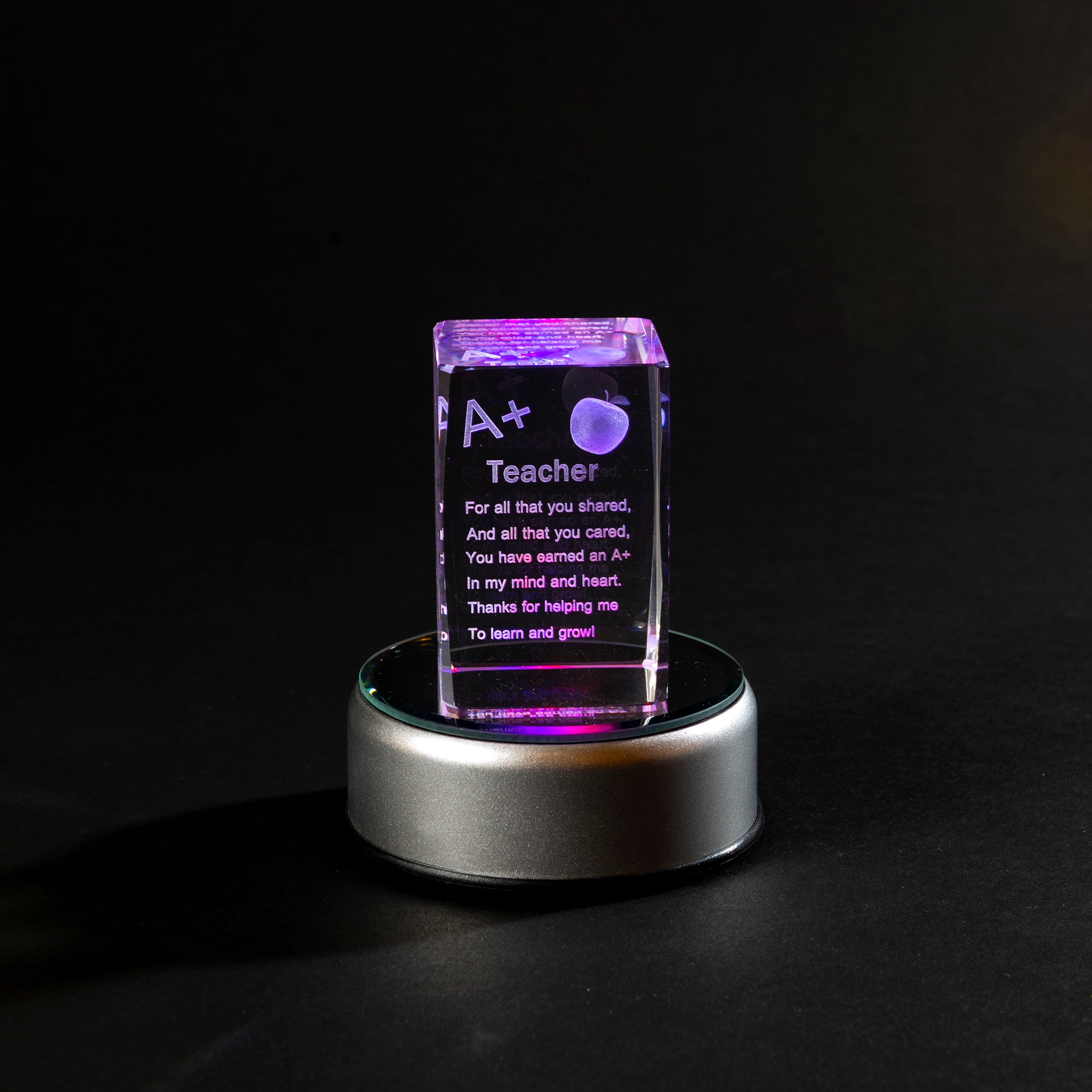 This 3D laser etched crystal block features a detailed etching of a poem for a teacher. The Laser Cube stands 3 inches tall, and is 1 3/4 inches wide. Add a light box base with this great laser engraved glass cube to illuminate the intricate details of this amazing design.