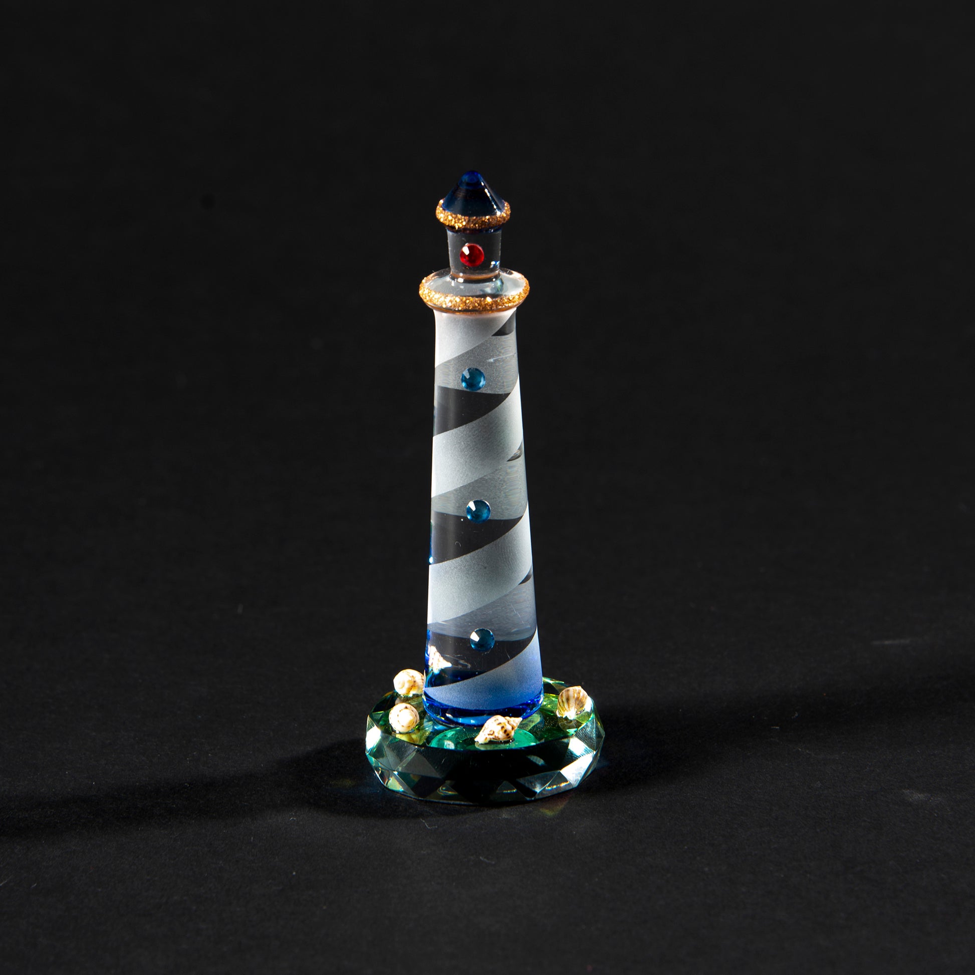 Crafted from high-quality clear borosilicate glass, the lighthouse features a sleek, modern design with a timeless appeal. The Swarovski crystal base adds a touch of sophistication, while the delicate sea shells surrounding the base evoke a sense of calm and tranquility.